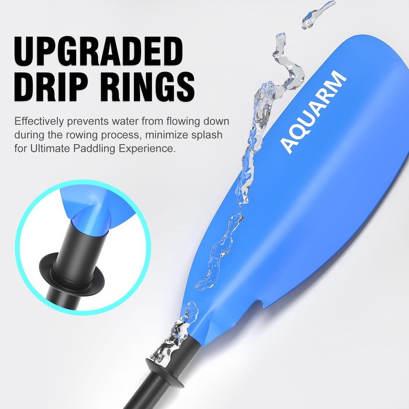 - 𝗧𝘄𝗼-𝗣𝗶𝗲𝗰𝗲 𝗖𝗼𝗻𝘀𝘁𝗿𝘂𝗰𝘁𝗶𝗼𝗻: The paddle can be divided into 2-piece construction paddles, which are convenient for you to carry and store away easily. The water-retaining rings at both ends can effectively prevent the water from flowing down during the rowing process and ensure that the hull does not enter the water