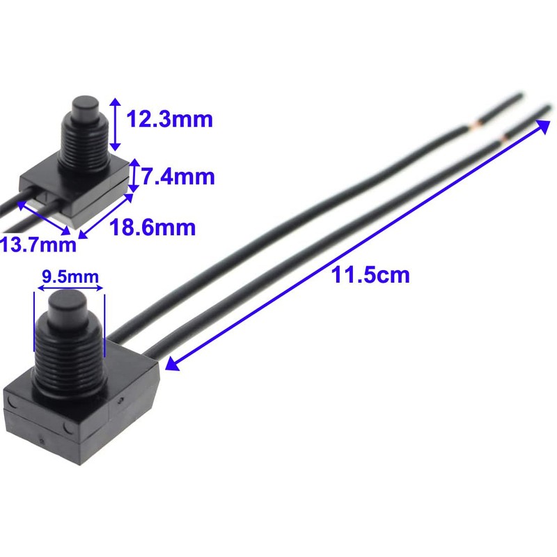 The waterproof push button switch with black rubber boot features 11.43 cm cable with 18 AWG and stripped end lengths of 0.64 cm.