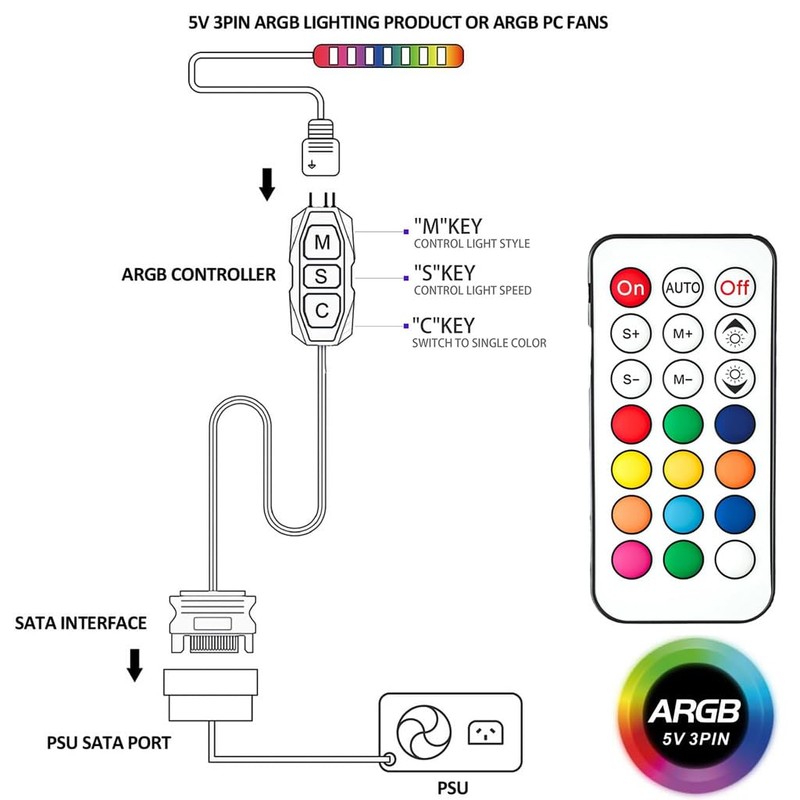 - This ARGB controller offers multiple dynamic lighting modes and 12 static color options. Power is supplied via the SATA interface of the enclosure. Ideal as an independent RGB hub.