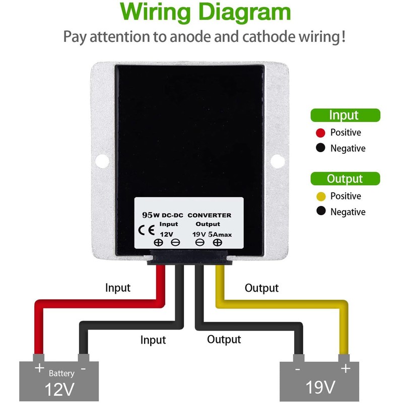 - DC 12V to DC 19V, Input voltage range DC 10-16V; Output voltage: DC 19V (not adjustable); Output current: 5A; Output power: 95W