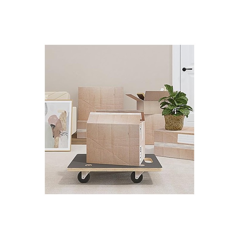 These dolly trolleys are perfect for moving furniture, appliances and general bulky items effortlessly, safely and smoothly around your house or office. Stable material: Plywood is a stable and impact-resistant material. It has an even texture without fibers showing and is resistant to warping and splitting.Anti-slip surface: The anti-slip surface made of phenol formaldehyde resins ensures an optimal grip and prevents slipping when moving items.Flexible mobility: The moving trolley is equipped with abrasion-resistant rotatable castors, making transporting heavy items more stable and smoother in any direction that you want.Compact and handy design: The furniture mover with wheels is easy to carry and store in small spaces. And the integral carry handle is designed for easy transport and hanging.Material: Plywood with PF (phenol formaldehyde resins) covering, pp (polypropylene)Overall dimensions (each): 23.6" x 15.7" x 4.5" (L x W x H)Board thickness: 0.71"Caster diameter: 3"Maximum load capacity: 551.2 lb4 wheels without lockAssembly required: YesPackage contains:2 x Dolly trolley