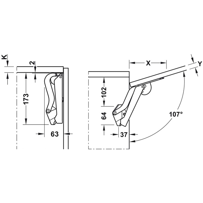 - Flap support, spring force 240 N, opening angle 75° or 90° and with height adjustment. Mounting: for screwing into 32 mm row of holes