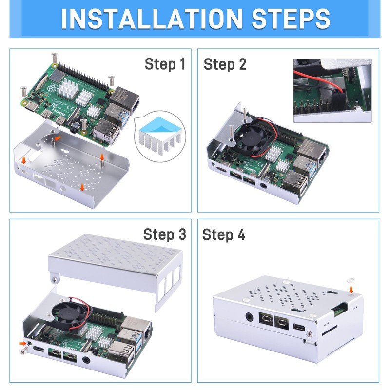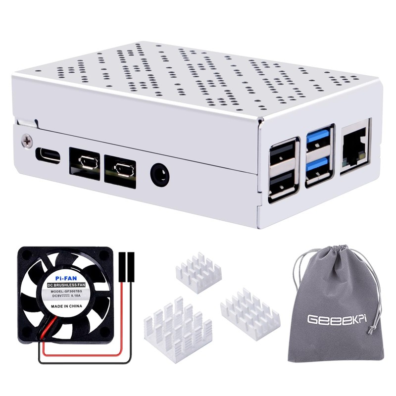 - Package Includes 1x Aluminum Case for Raspberry Pi 4, 1x Cooling Fan, 3x Aluminum Heatinks, 4x Rubber Feet, 1x Screw Pack, 1x Screwdriver