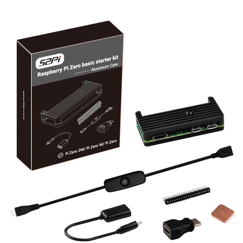 - Package includes: an Aluminum Case, copper heatsink, switch cable, OTG cable, HDMI adapter, GPIO header, and a screwdriver.