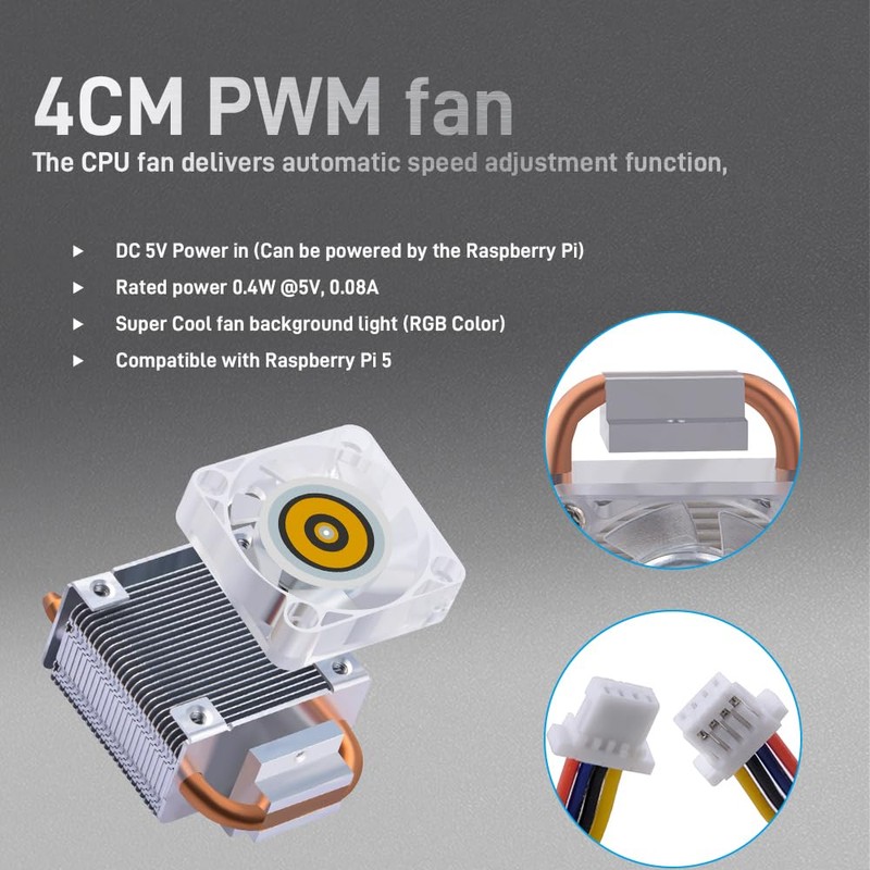 - 【RGB PWM Fan】This fan can be adjusted by PWM. The official Raspberry Pi OS supports the speed adjustment function. The system will adjust the speed based on the temperature of the motherboard.