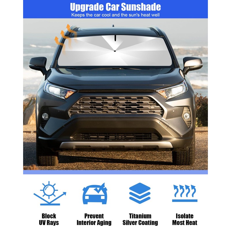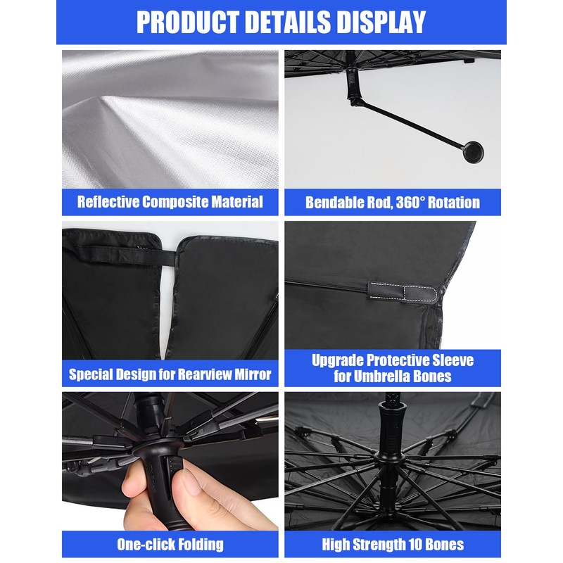 - Hochwertiges Material: Unser Windschutzscheiben Sonnenschutz verfügt über eine Titan-Silber-Klebebeschichtung mit Verbundpolyester, und die 10 verstärkten Skelette und die stabile Stütze sorgen für die Langlebigkeit und Korrosionsbeständigkeit dieses Auto Sonnenschutz Frontscheibe