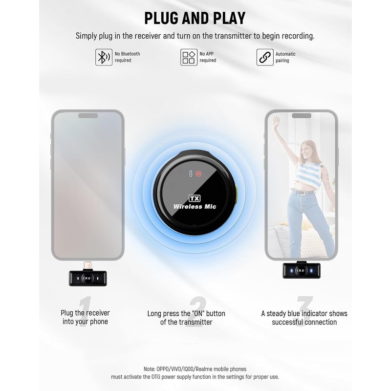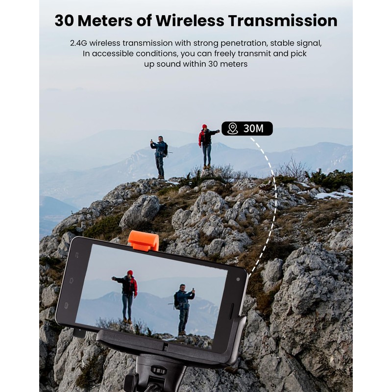 - Automatic Pairing & Plug And Play: This mini microphone is very convenient, supporting automatic pairing and plug and play without the need to connect Bluetooth or apps. The upgraded wireless microphone adopts 2.4GHz wireless transmission technology and a 30M barrier free transmission distance, ensuring that you can move freely during recording