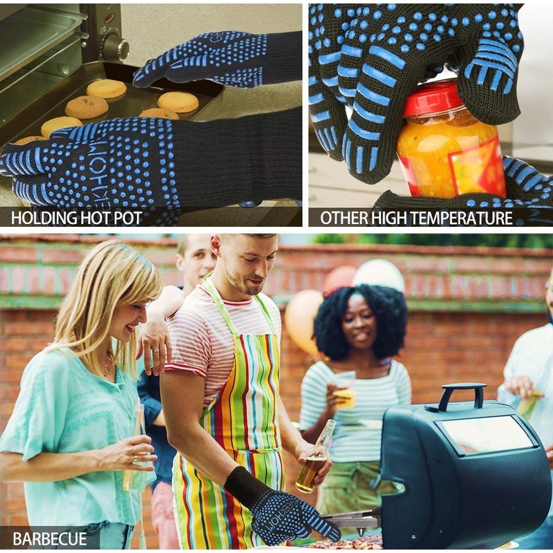 - 【Triple structure, maximum heat resistance 1472 ℉】GEEKHOM oven gloves made of high-quality kevlar fabric, a type of professional heavy-duty synthetic grill material, heat resistant, cut resistant, the outer layer is covered with non-slip silicone material. The second layer is a strong aramid fiber with excellent heat resistance and blade resistance. The inner layer is made of fine cotton.