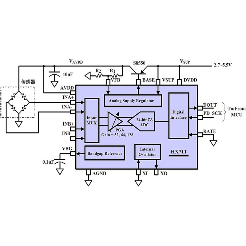 • This HX711 module uses 24 high precision A/D converter chips hx711. It is a specially designed for the high-precision electronic scale with two analogue input channels the internal integration of 128 times the programmable amplifier