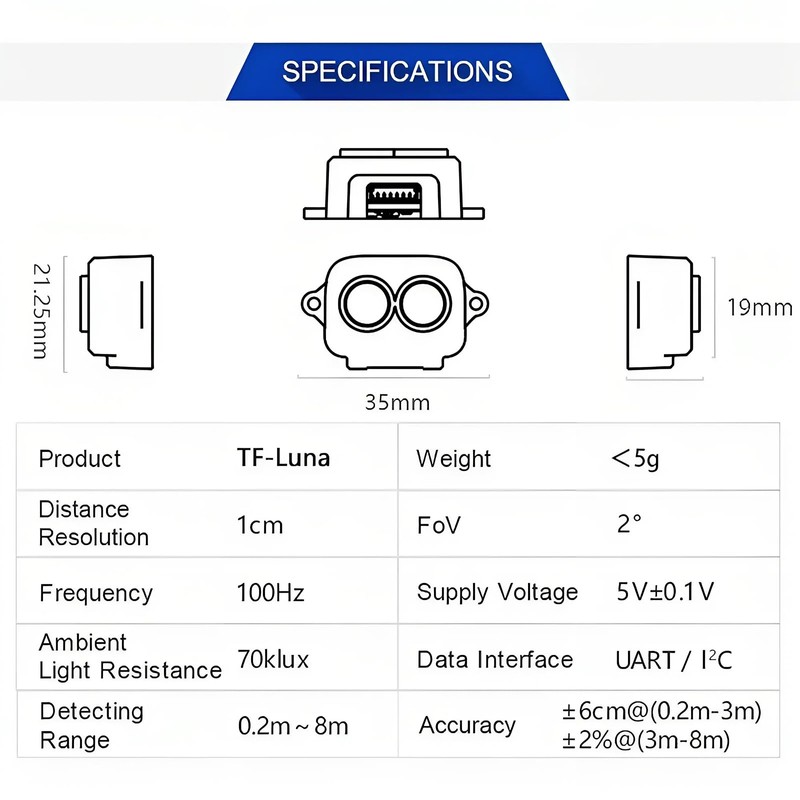 • 【Product】: Model: TF-Luna, Operating range: 0.2-8m, Distance resolution: 1cm, Power comsumption: not over 0.35W, Frame rate: 1-250Hz, Frequency: 100Hz, FOV: 2 degree, Net weight: not over 5g, Communication: UART/I2C interface, Power supply: 5V