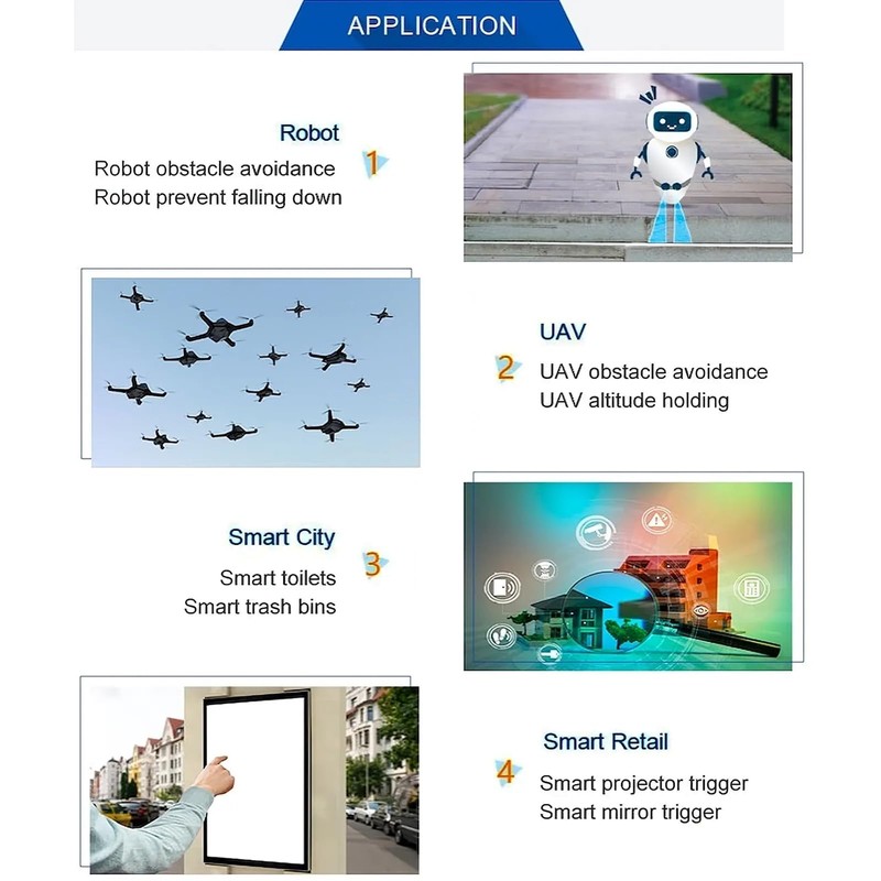• 【Application】: Traffic Monitoring, Obstacle detection, Level measurement, Smart device, Security and obstacle avoidance, Drone altitude holding and terrain following