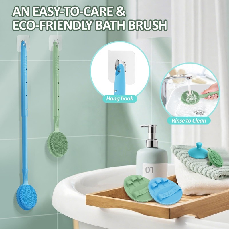 - 【BACK SCRUBBER - Adjustable 12-Length Extra-Long Handle】Back brush's handle can be adjusted to five different lengths to meet different needs. Shortest one is perfect for hand-hold brushing, medium length for scrubbing back and legs, longest one for brushing feet and toes without bending, which is especially friendly to seniors, pregnant and people with limited mobility. The unique extendable handle brings excellent non-slip experience to your shower!