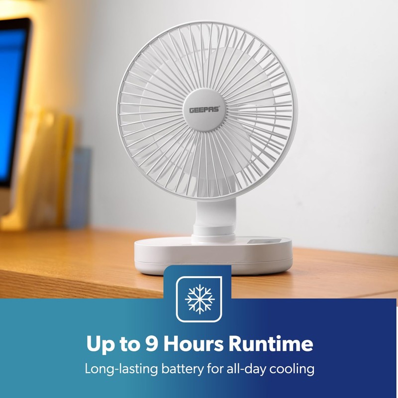 - ✅ LONG-LASTING OPERATION: With a robust battery capable of up to 9 hours of continuous operation on a single charge, this Geepas fan is perfect for all-day use, ensuring you stay cool and comfortable in any situation.