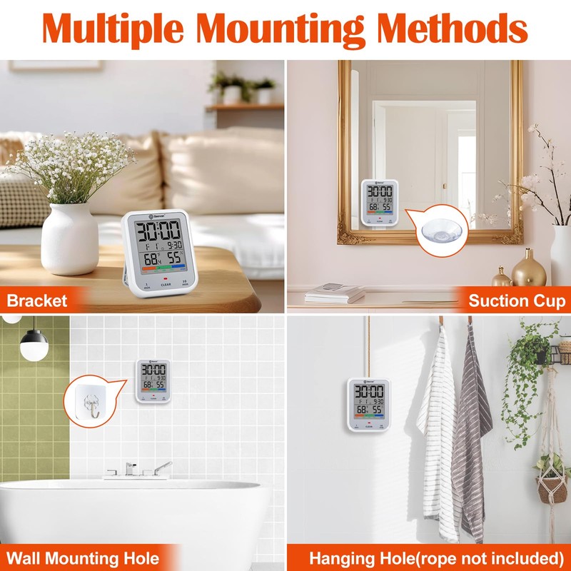 - [Tips] Before attaching the suction cup to a clean and dry mirror, add a bit of moisture to the suction cup for better adhesion. Periodically check the suction strength to ensure it securely holds the digital clock for bathroom battery operated to prevent any accidental falls.)