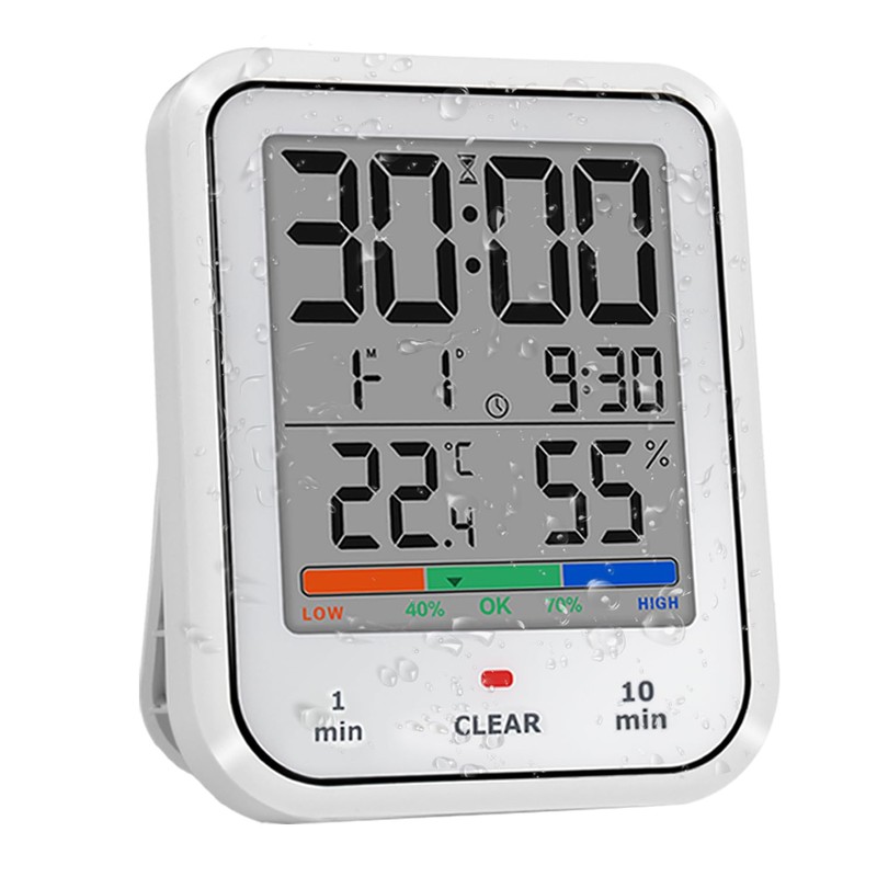 - [Waterproof & Versatile] The shower clocks comes with an IP 24 water and spray resistance, the fully enclosed design on the screen surface and the rubber ring design in the battery compartment can can prevent water from entering the interior of the shower clock with timer to the greatest extent possible. Bathroom mirror clock with large screen can withstand water splashes and humidity, ensuring shower timer shut off for teens remains functional and reliable even in wet conditions. Suction cup clock with humidity and temperature is perfect time management tool for saving time and water in bathroom, kitchen, spa area, laundry, office.