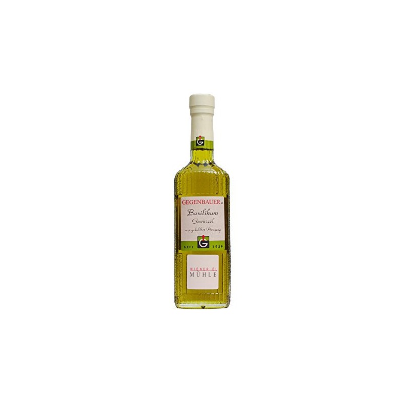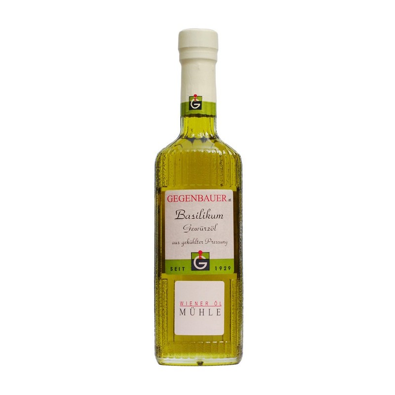 In the Vienna oil mill by Erwin Gegenbauer, sunflower seeds are ground together with basil. From this, the spice oil is obtained in a special cooled pressing process. Give your creations the finishing touch and personal touch. Enjoy experimentation. For salads, pasta, vanilla ice cream, for searing or refining fish and meat, over cooked vegetables or soups. Let your imagination run wild. Ingredients: Basil spice oil. Ingredients: sunflower oil, basil. Store dark and cool. Nutritional values per 100 g/100 ml: calorific value: 882 kcal / 3693 kJ, fat: 99.8 g, of which saturated fatty acids: 11.6 g, carbohydrates: 0g, of which sugar: 0 g, protein: 0 g, salt: 0 g