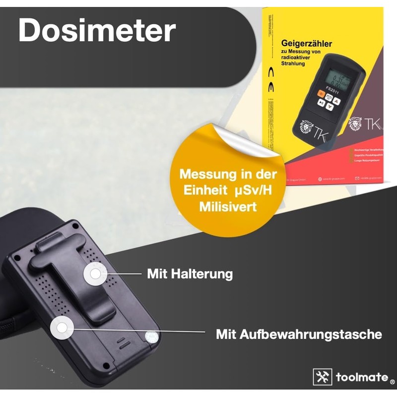 - Geiger counter in handy format for measuring radiation - Product with German instructions - Geiger counter for measuring radiation in the Milisievert unit in the range from 0.01 to 1000 μSv/h - Dosimeter for accurate determination of radiation intemsity of objects - with alarm sound