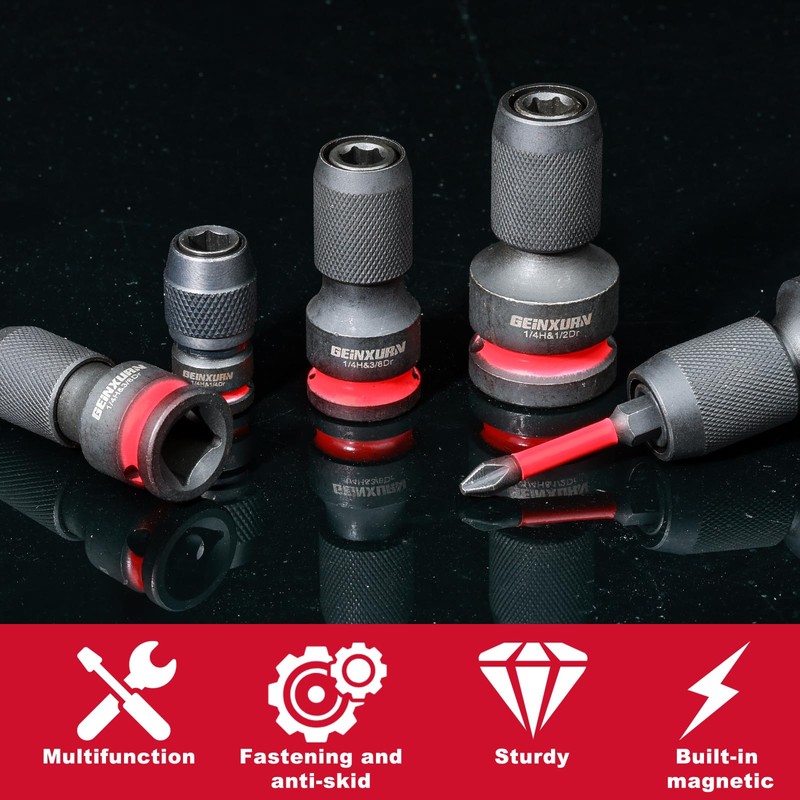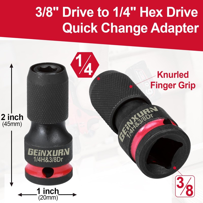 - 3/8" to 1/4” Impact Bit Holder: 2 Pieces hex impact socket adapter can transform the wrench into a drill or ratchet into a driver. The square driver side and the 1/4" female hex side can provide socket-to-bit conversions