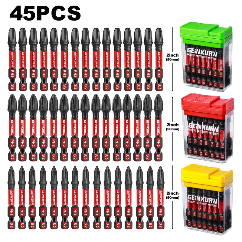 Geinxurn Impact Phillips Screwdriver Bits Set,45 Pcs 2" Magnetic(PH1/PH2/PH3) S2 Steel Multi Driver Bits with Storage Colorful Box