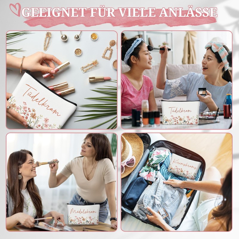 - Edles Design: Das Blumenmotiv der Kosmetiktasche ist hell und elegant; Die drei Kosmetiktaschen sind mit verschiedenen Aufdrucken bedruckt: „Krimskrams“, „Tüdelkram“ und „Mädelskram“; Die verschiedenen Aufdrucke erleichtern Ihnen die Unterscheidung der verschiedenen Kleinigkeiten; Der elegante Reißverschluss sorgt für die sichere Aufbewahrung Ihrer Kleinigkeiten