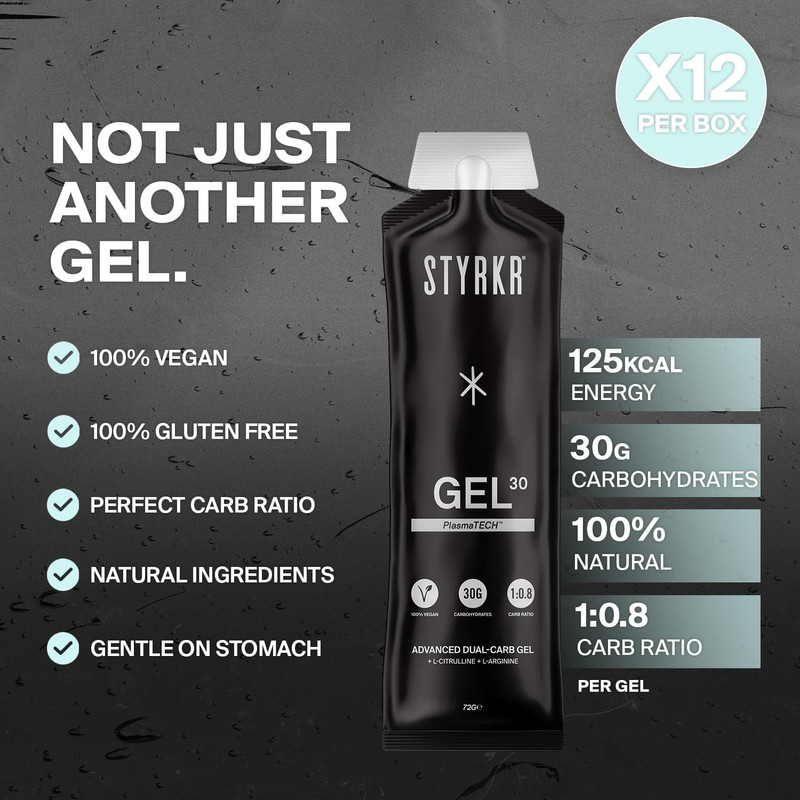 GEL30 Energy Gels by Styrkr - 30g of Carbs - Pack of 12 Energy Gels for Running & Cycling - Approved by Endurance Athletes - Advanced Dual-Carb Formulation - GEL30 12x Pack