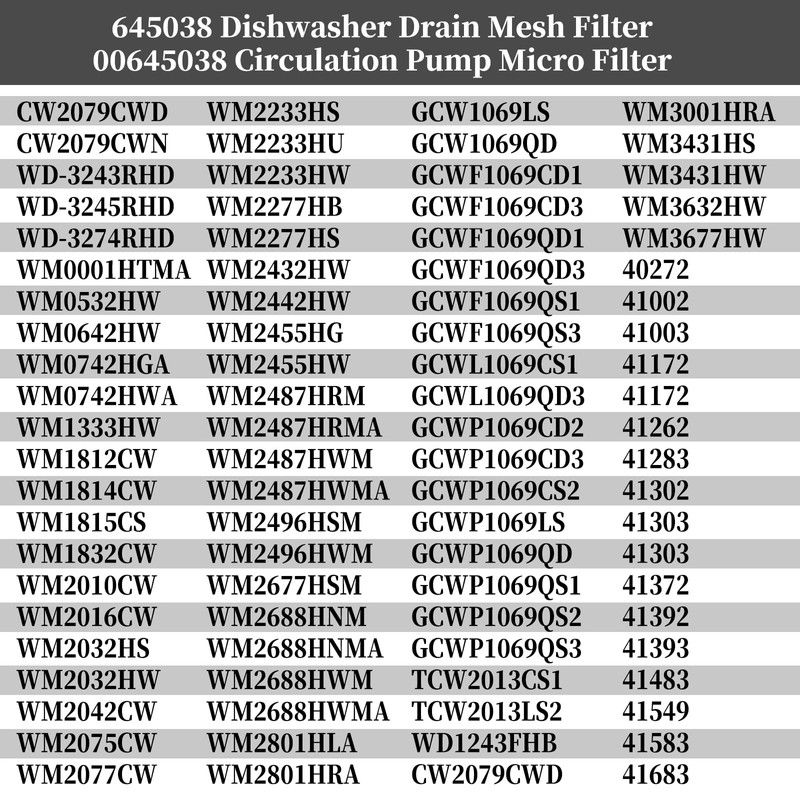 • 00645038 Dishwasher Micro Filter Replaces Bsh 00645038, 00651097, 645038, 651097, AP4339631, 1560725, AH3479708, EA3479708, PS3479708, PS8730270.