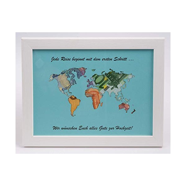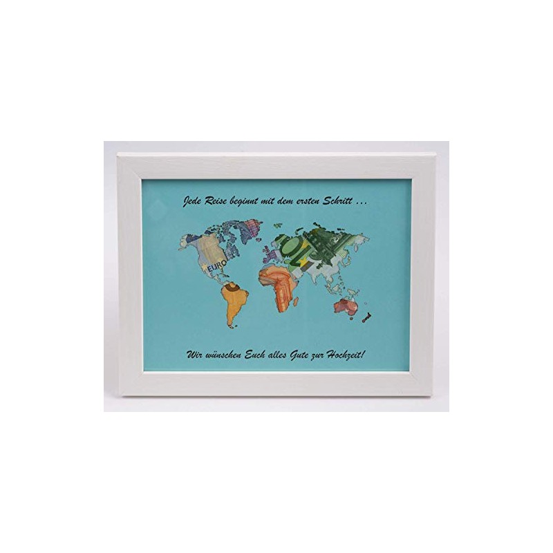 Geld in einen Umschlag übergeben finden Sie nicht besonders schön? Wie wäre es mit einer Weltkarte die aus Geld besteht und das ganze ohne viel Aufwand. Dieses Geldgeschenk ist perfekt für eine Hochzeiten an der Sie Geld verschenken wollen. Der weiße Bilderrahmen ist ca. 27 x 21 x 1,4 cm groß, in welchem sich die Weltkarte befindet. Die Welt wurde aus farbigen Karton geschnitten, so brauchen Sie das Geld oder auch andere Bilder nur dahinter legen und erzielen sofort ein ganz besonderes und einzigartiges Geschenk. Für den schöneren Effekt wurde eine Glasscheibe verwendet sowie die Holzstruktur in der Oberfläche erhalten. Der oben genannte Artikel beinhaltet: - Bilderrahmen Farbe: weiß - Weltkarte in hellblau (ohne abgebildeten Geld) inkl. dem hier abgebildeten Text. Der Bilderrahmen kann quer aufgehängt oder aufgestellt werden.