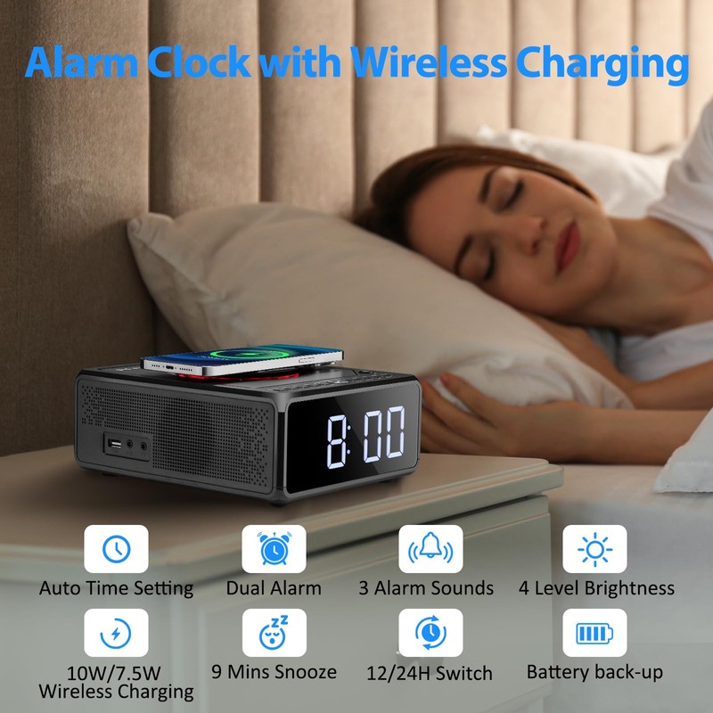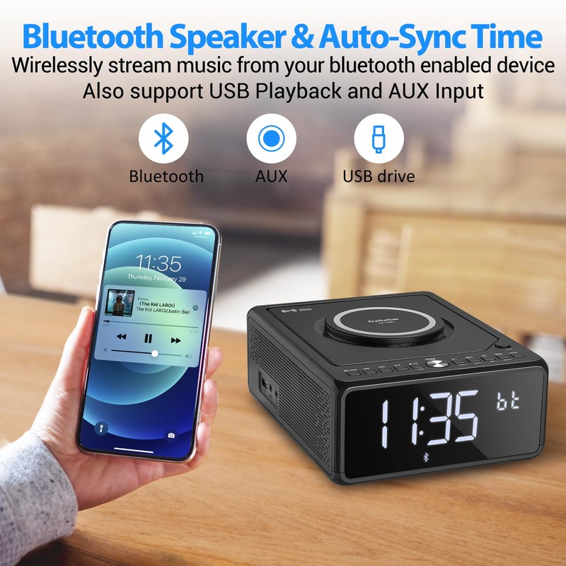 - 【Dual Alarm Clock with Wireless Charging】This CD alarm clock can set 2 alarms, convenient for family members with a different schedule.Wake up with your favorite music, radio station or Dee Dee, start your day fresh with a good mood! SNOOZE function let you enjoy extra 9 minutes of slumber. It also features unique top wireless charging ! Which can charge your smart phone with Qi-enabled function quickly and easily. (Max output 7.5W for IOS, 10W for Android). Support Auto-Sync time via Bluetooth.
