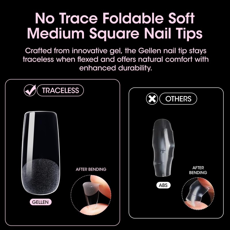- TIME-SAVING: Gellen square nail tips feature a convenient semi-matte interior that adheres securely to natural nails, minimizing the risk of lift-off. The outer surface features a clear, smooth finish for faster coloring without the need for additional filing.