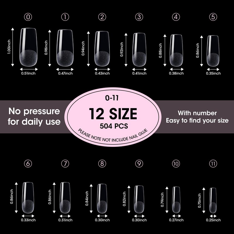 - EASY TO USE - Pre-numbered sizes are featured on each tip, allowing both beginners and experienced manicurists to select quickly and accurately. This intuitive approach helps minimize application errors and reduces setup time. This set contains 504 items in 12 sizes, ensuring you have the flexibility to achieve the style you want.