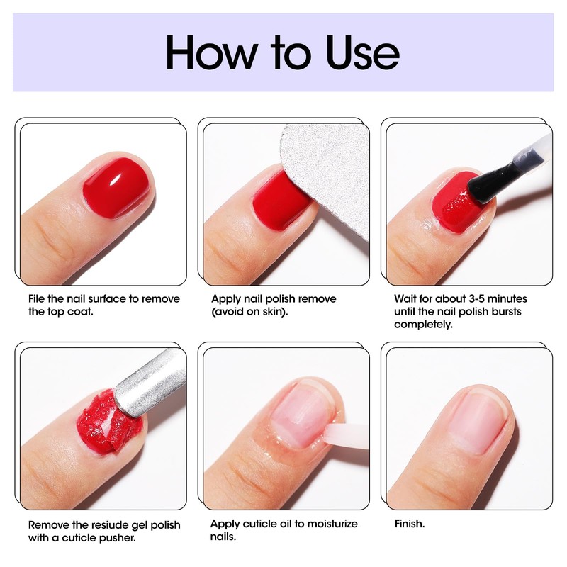 - ❤ Quick and Easy: File off the top coat and apply nail polish remover on your nails. Just wait for about 2 minutes and you will notice that the nail polish will peel off naturally. Say goodbye to the traditional and tedious way of gel nail polish removal, you can easily and effectively remove nail polish at home.