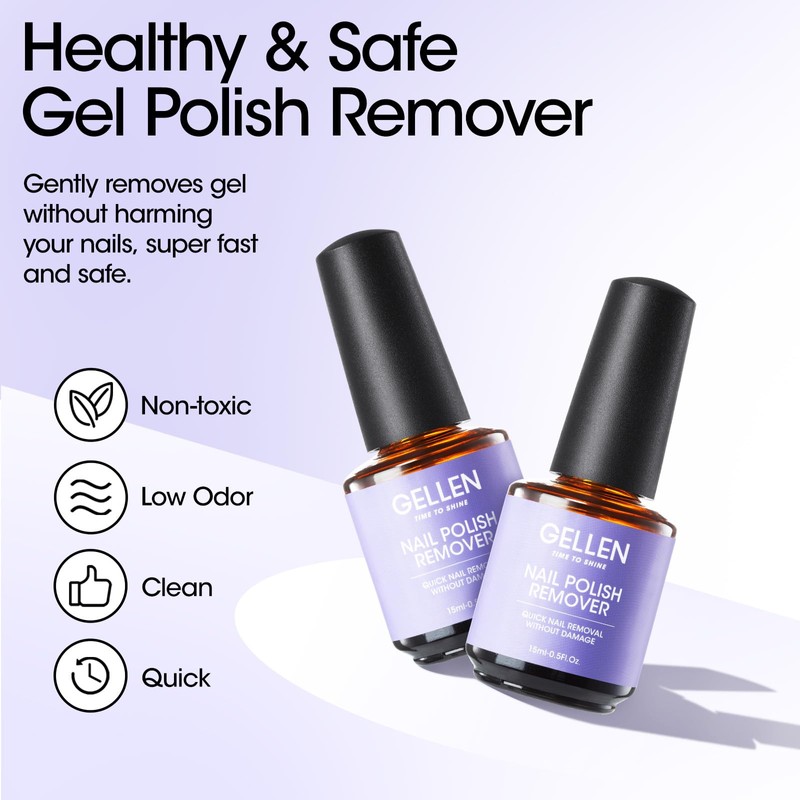 - ❤ Professional Gel Polish Remover: The faster and safer way to remove gel nail polish! The Gellen Gel Nail Polish Remover Kit contains 2pcs 15ml gel polish remover, cuticle oil pen, steel pusher, and nail file, which effectively helps you to easily remove nail polish in 2-5 minutes without damaging your nails.