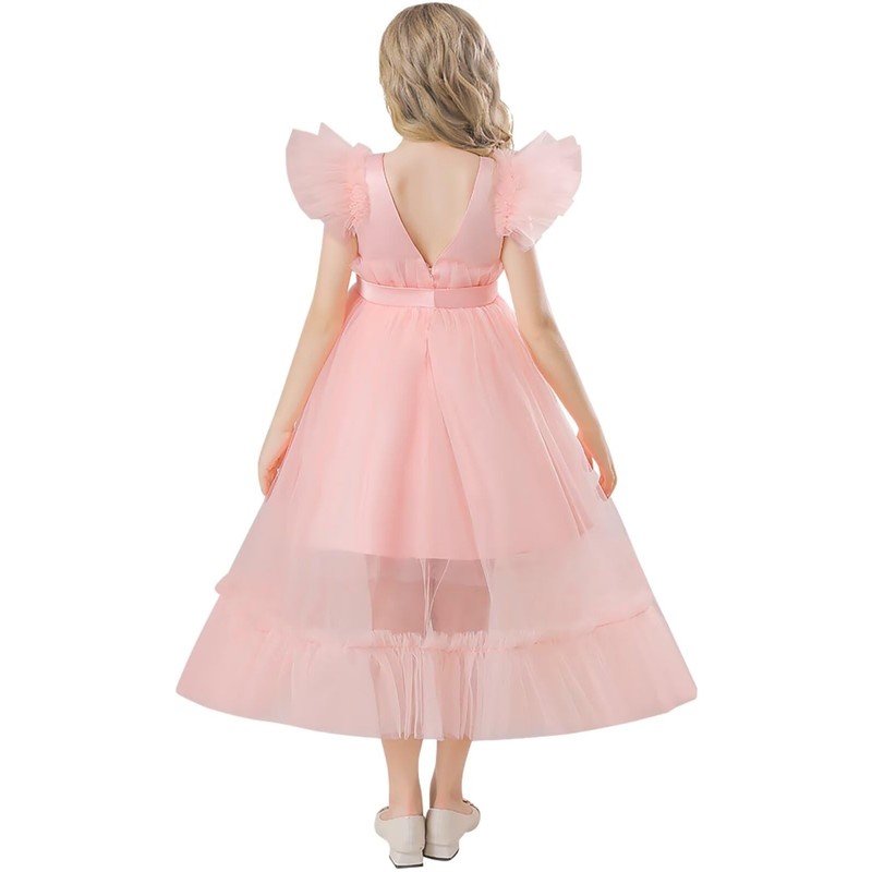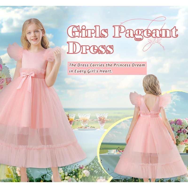 - FEATURE: Girl satin tulle dress, fashion and unique design. Hidden back zipper design easy for girls to wear and off, premium satin material make dress more textured, elegant waist bow tie adds a dreamy feel. Girls fashion ruffle sleeve princess dress, multi-layered tulle makes the dress look more three-dimensional. Girls white wedding dress, birthday graduation blue princess dress, party pageant pink dress, Champagne banquet dress.