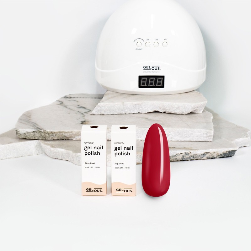 Apply Gelous Base Coat, Gelous Builder Gel (optional), Gelous Colour Coat, then Gelous Top Coat, curing each coat with the Gelous UV/LED Gel Nail Lamp for a strong gel manicure that lasts over two weeks!