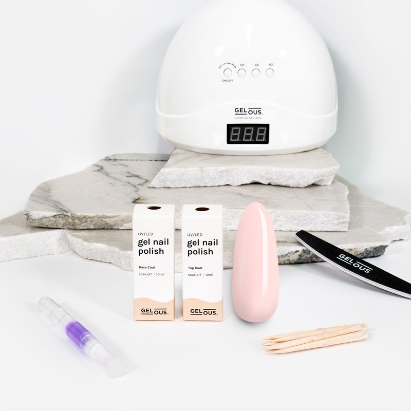 Apply Gelous Base Coat, Gelous Builder Gel (optional), Gelous Colour Coat, then Gelous Top Coat, curing each coat with the Gelous UV/LED Gel Nail Lamp for a strong gel manicure that lasts over two weeks!