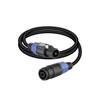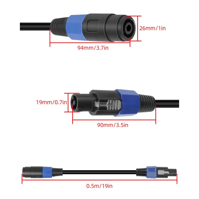 - Speakon male-to-female cable extensions with black + blue male and female connectors at both ends for mixers, amplifiers, audio equipment, room speakers, and subwoofers.