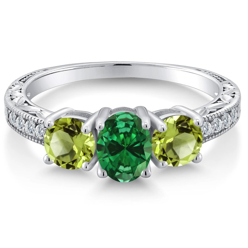 Gem Stone King 925 Sterling Silver 7X5MM Oval Green Simulated Emerald and 5MM Round Green Peridot Women Ring (1.72 Cttw, Gemstone Birthstone, Available In Size 5, 6, 7, 8, 9)