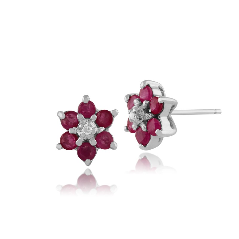 - Treat her or yourself with a classic pair of floral stud earrings features 6 brilliant round ruby gemstones surrounding a central single cut white diamond.