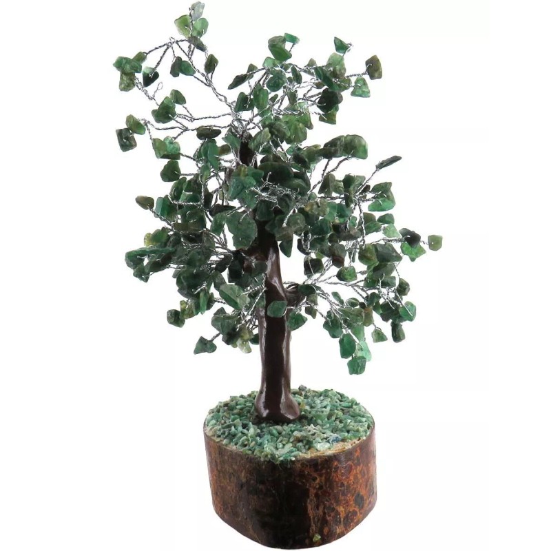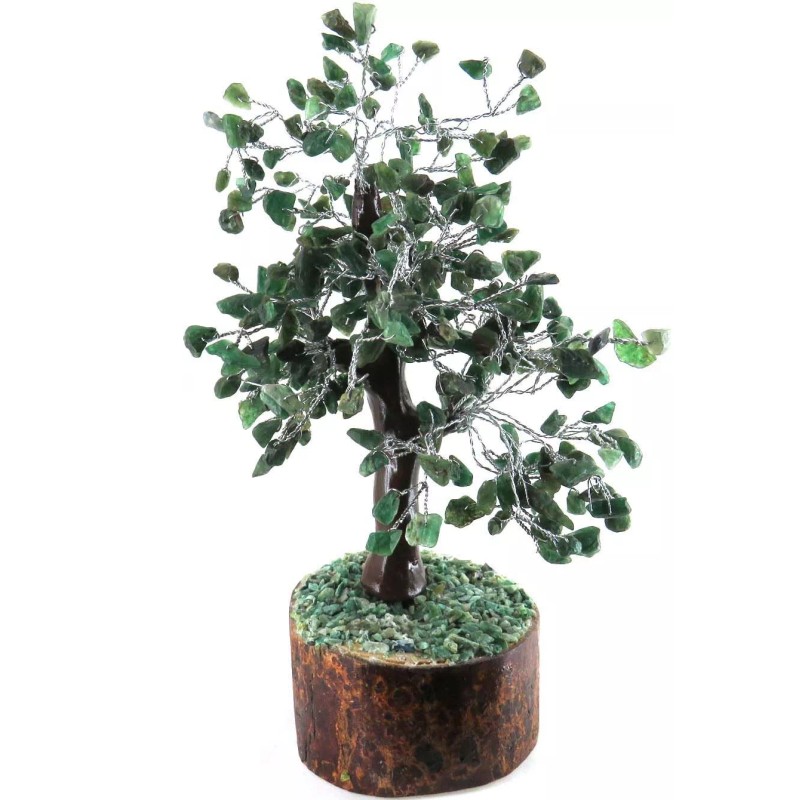 Beautiful clusters of Green Aventurine ‘leaves’ with branches made from bright non-tarnish, flexible wire, anchored in a natural wood base. This tree features 300 polished Green Aventurine stones in an assortment of natural colors and shades, each one connected separately to its own branch. The wire branches are bendable so the tree can be shaped to your liking. Hand made in India.