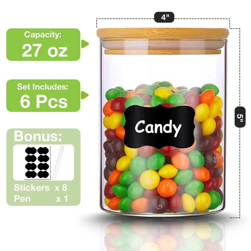- 【Set of 6 Glass Jars】 The package includes 6 packs of 27 oz clear jars with airtight bamboo lid, come with 8 Pcs erasable black Labels & 1 Pcs liquid chalk pen. Thickened glass food storage jars to meet your daily needs.