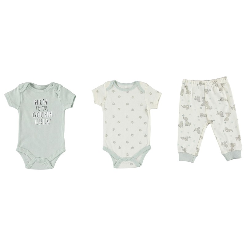 - Onesie Odyssey: This 2-pack onesie set, crafted from soft material, is the ultimate in baby clothes. Each onesie features a delightful print and snap closures, making them the heart of our charming jogger set.