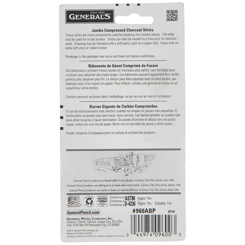 General Pencil 136357 Jumbo Compressed Charcoal Sticks, Black, 3-Pack