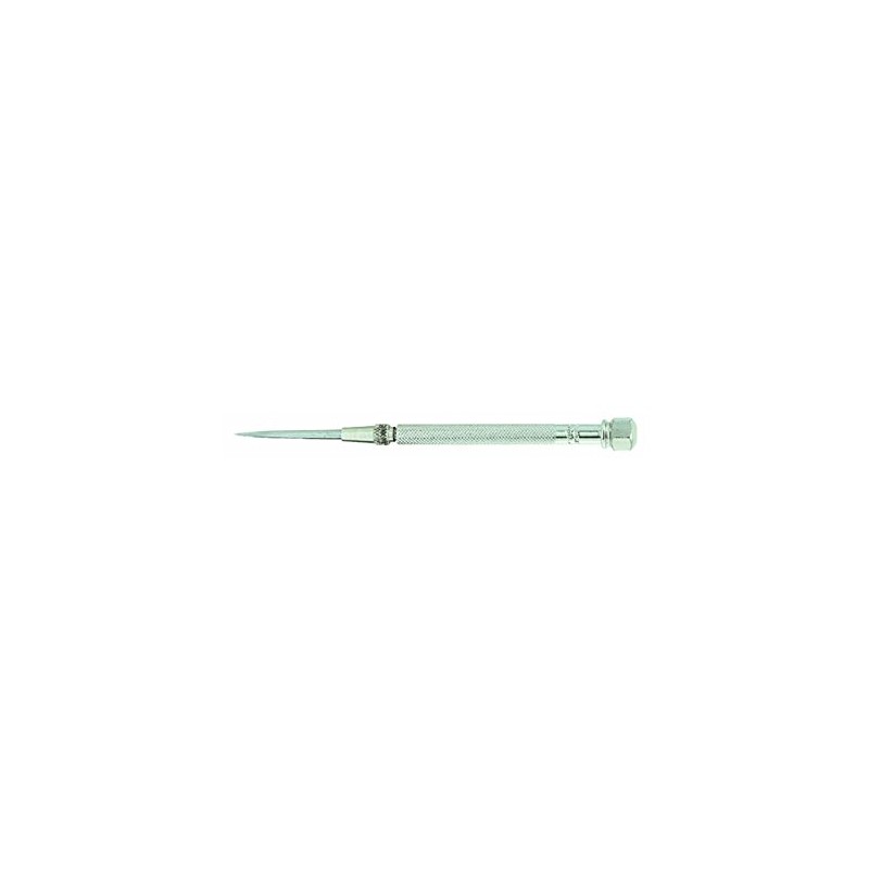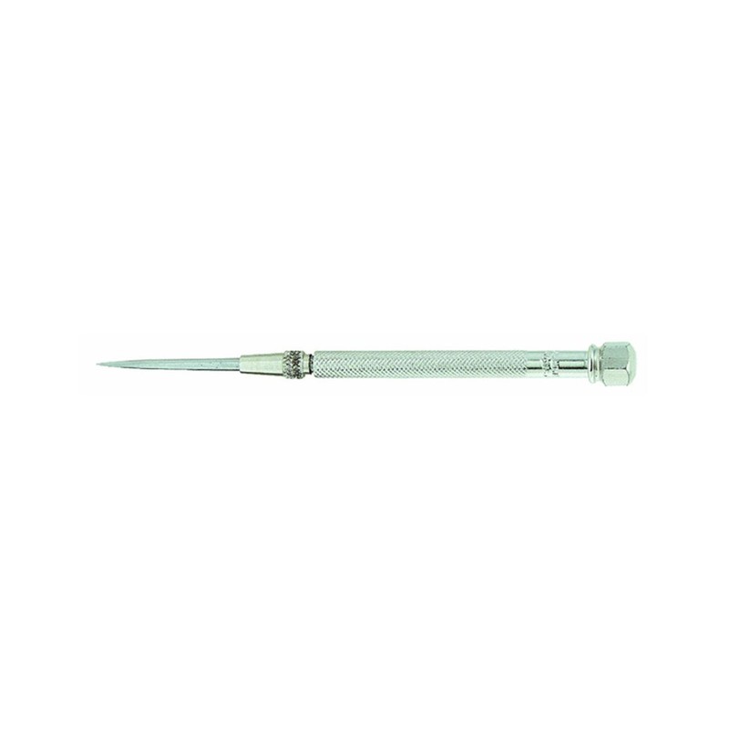 This pocket scriber has a replaceable hardened and centerless ground point. The point reverses into knurled body for safety. The body diameter is 1/4".