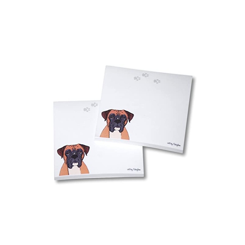 Boxer Sticky Notes - Uncropped Our Boxer sticky notes are a DogLoverStore exclusive. Created in collaboration with Sabyloo, these sticky notes are cute and convenient. Therefore, you can use them in your home, office, or anywhere you need to jot down a quick note. The dog breed artwork is by Sabyloo, a New York based artist who loves all things dogs. The notepads are authentic brand and come in a set of two. Each pad has 50 sheets, totaling to 100 sheets. Also, each design features the uncropped Boxer with 3 dog paws extending across the top. In addition, the designs are printed on white paper with rich pigmented ink. Above all, each sticky note is fully designed and printed in the USA. Measures 3 inches by 3 inches. - Includes: 2 Notepads - 50 Sheets Each - 100 Sheets Total - Self-adhesive Backing - 3in. x 3in. - Designed & Manufactured in the USA