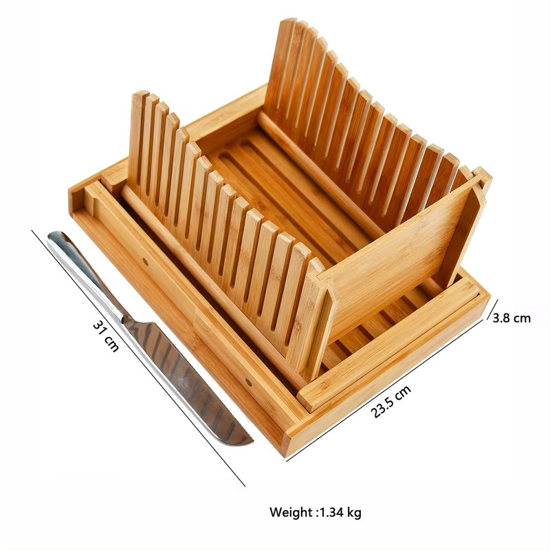 - DURABLE DESIGN: Crafted from sturdy bamboo with a non-slip base and guide rails, this bread cutter is built to last through regular home baking use