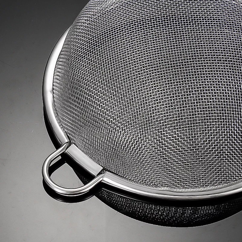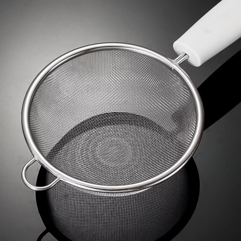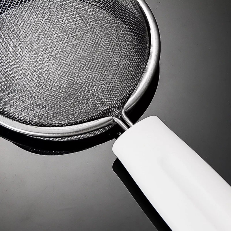 2. Diseño multifuncional: el colador de malla fina de acero inoxidable se puede utilizar para filtrar la leche de soja, recoger ingredientes, freír alimentos y otras escenas.