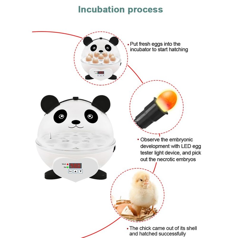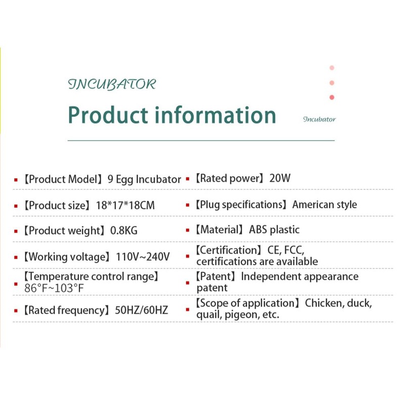 Product Description: Rated power: 20w Product weight: 0.9kg Material: ABS plastic Product size: 22*20*20cm Rated frequency: 50HZ/60HZ Working voltage: 110V-240V Temperature control range: 86-103 ℉ Application scope: chicken, duck, quail, pigeon, etc. Feature: Energy saving, low noise, low power consumption. The incubator can hold 9 eggs, Mini size,Transparent lid,it is easy to clean. Transparent body: With a transparent upper cover, it is convenient to observe the hatching situation of the breeding eggs and the hatching process is clear at a glance. Tips: 1. In order to improve the hatching rate of eggs, it is recommended to turn the eggs manually every day during incubation 2. Artificially raised eggs cannot hatch. How to judge a fertilized egg (hold the egg and look at the light. If there is flocculent near the yolk, it is a fertilized egg). 3. Fresh eggs: The hatched eggs are required to be fresh. The eggs are within 7 days of birth and the goose eggs are within 10 days of birth. If the storage time is too long, the success rate of hatching will be affected. 4. Incubation temperature: 24 hours before incubation, the storage temperature of breeding eggs should be between 86-103 ℉.If the temperature is too low, please use the foam incubator provided by us Package: 1x User guider 1x 9 Eggs Incubator 1 x Power cable with American plug