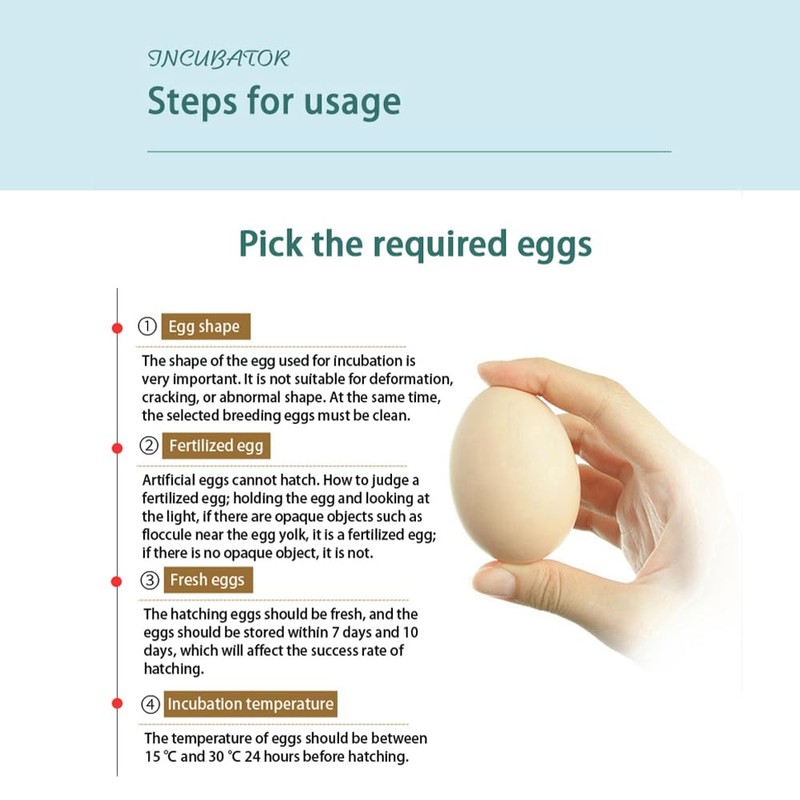 • Incubation temperature:The temperature of eggsShould be:between 59'F and 86'F 24 hours before hatching.