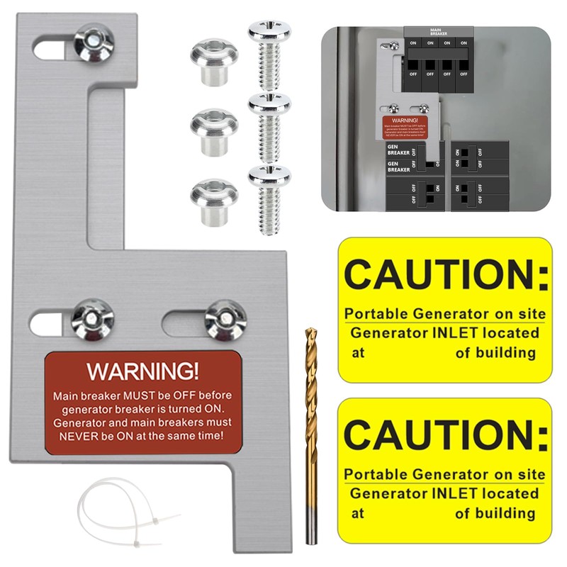 - 【PRODUCTS INCLUDE】Generator interlock kit top and bottom interlock plates x1, shoulder screws x3, hex nuts x3, generator start-up procedure label x1, reminder labels x5, generator breaker retainer straps x2(11.8 inches x2), 3/16''drill bit x1. installation guide x1.