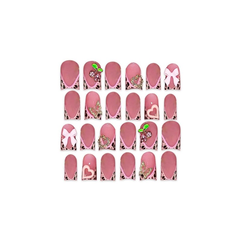 Generic Leopard Print French Tip Press on Duck Nails Medium With 3D Cherry & Heart Designs Pink Cute False Stick on Acrylic Nails for Women Manicure Kit